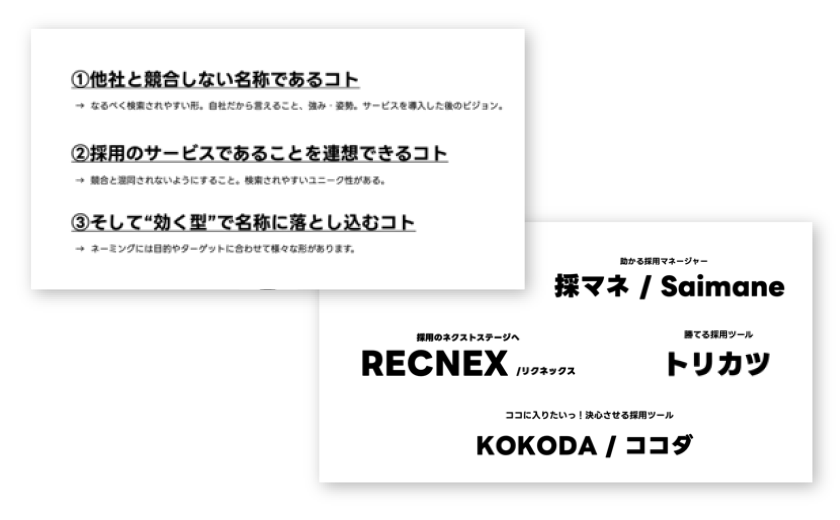 ネーミング事例を言語化型/機能型/効果・結果型/ターゲット型/に振り分けて、ネーミングの方向性をお客様と協議。
